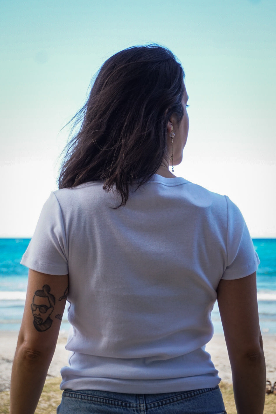 Made from organic cotton with a fine baby rib texture, it offers a gentle stretch that hugs in all the right places while remaining breathable and comfortable all day long. With its flattering, form-fitting cut and slightly cropped length, it’s perfect for pairing with high-waisted denim, skirts, or shorts.